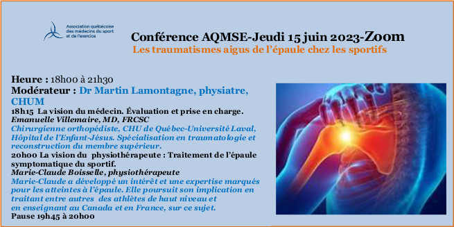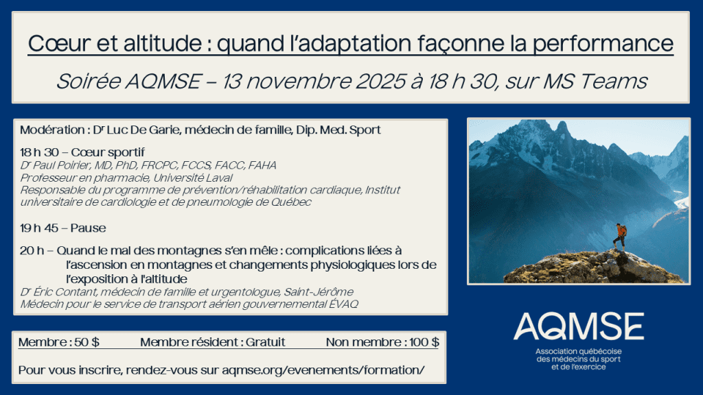 Pour la 2e année à l’AQMSE, outre notre congrès annuel, nous continuons à offrir des soirées de formations thématiques en médecine du sport. La 2e formation 2023 s’intitule :